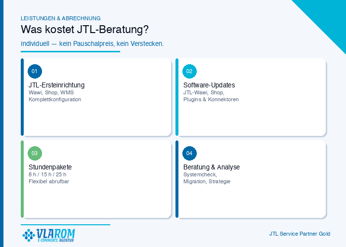 Als [JTL Service Partner Gold](https://www.jtl-software.com/partner-werden/) sieht Vlarom E-Commerce Agentur regelmäßig, was passiert wenn Händler auf Basis von Pauschalpreisen entscheiden: der eine zahlt für Leistungen die er nicht braucht, der andere bekommt kein Angebot weil sein Projekt „zu klein“ klingt. Wir kalkulieren deshalb immer individuell — und erklären im Erstgespräch offen was das für deinen konkreten Fall bedeutet. Das ist kein Verkaufsargument, sondern die praktische Konsequenz aus über 300 aktiven Kunden: pauschale Preise passen selten zur Realität eines mittelgroßen Händlers, der migriert, skaliert oder seinen Shop umbaut. Was wir versprechen können: vor der Beauftragung weißt du was das Projekt kostet.